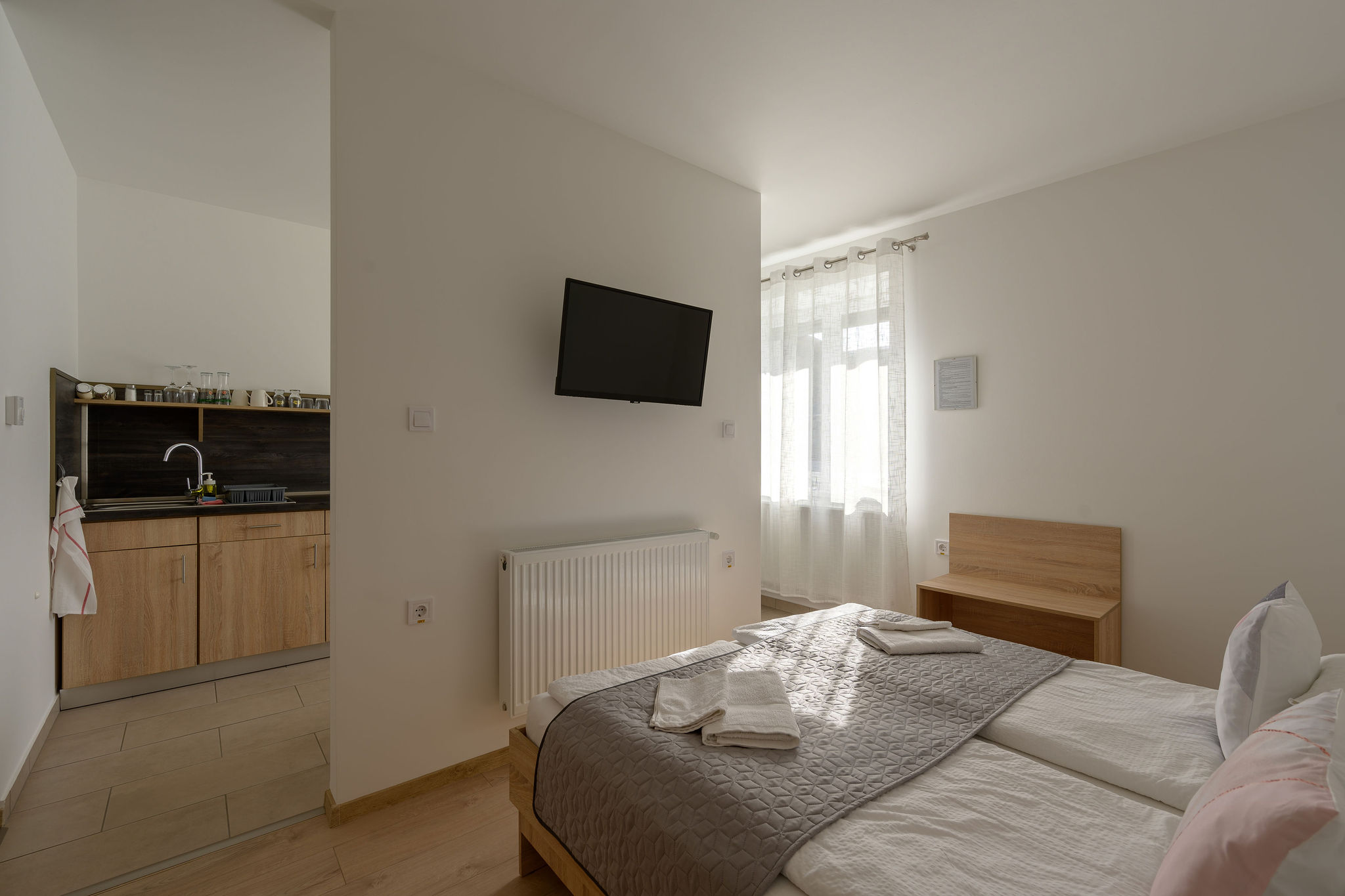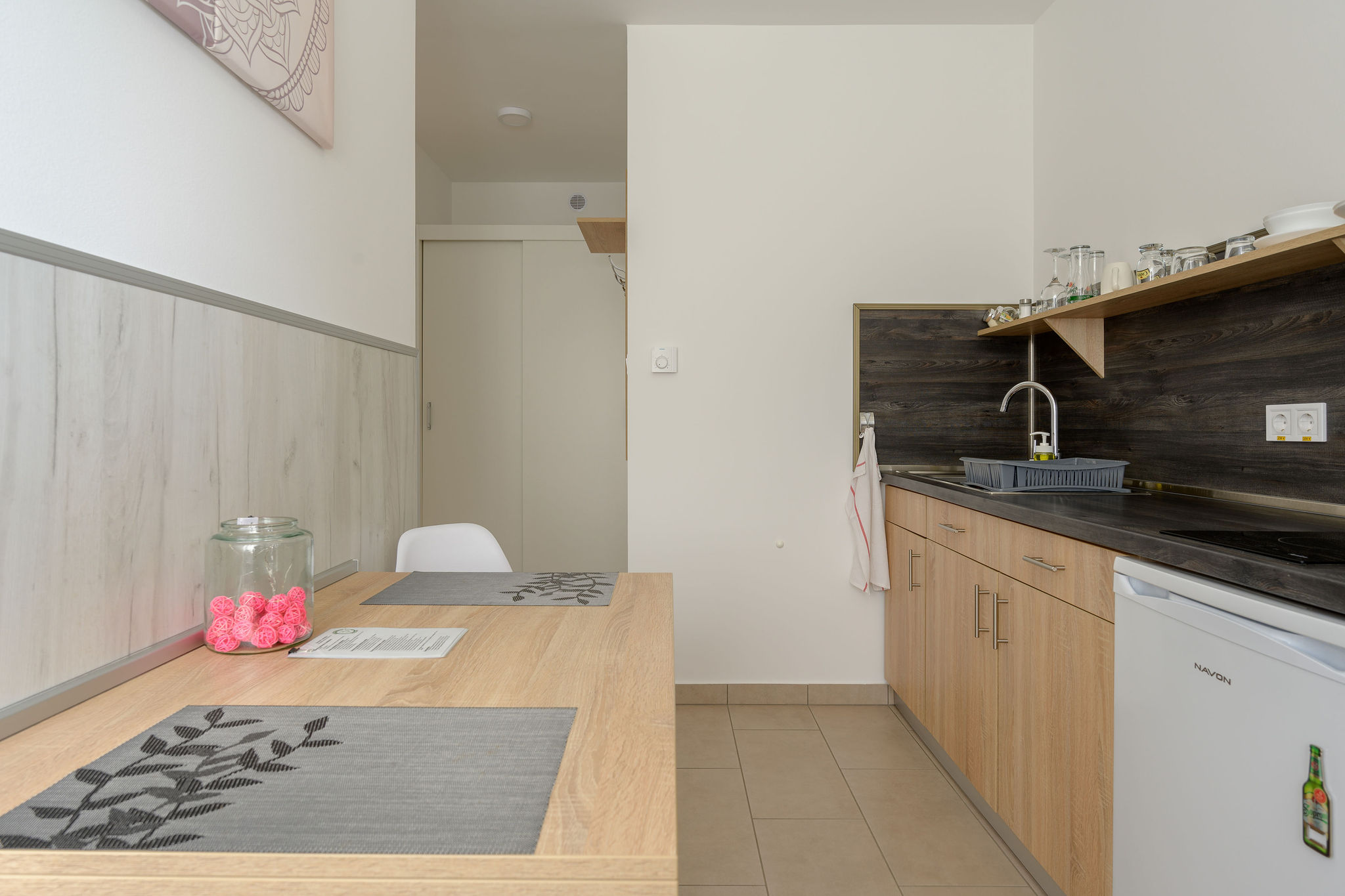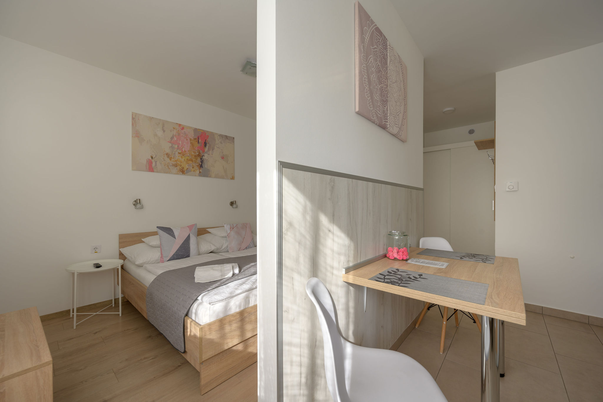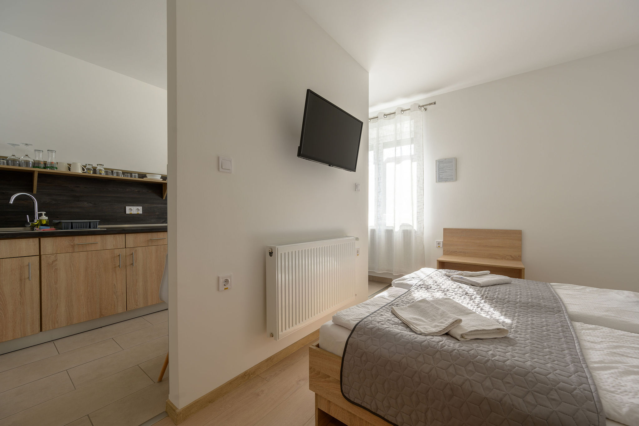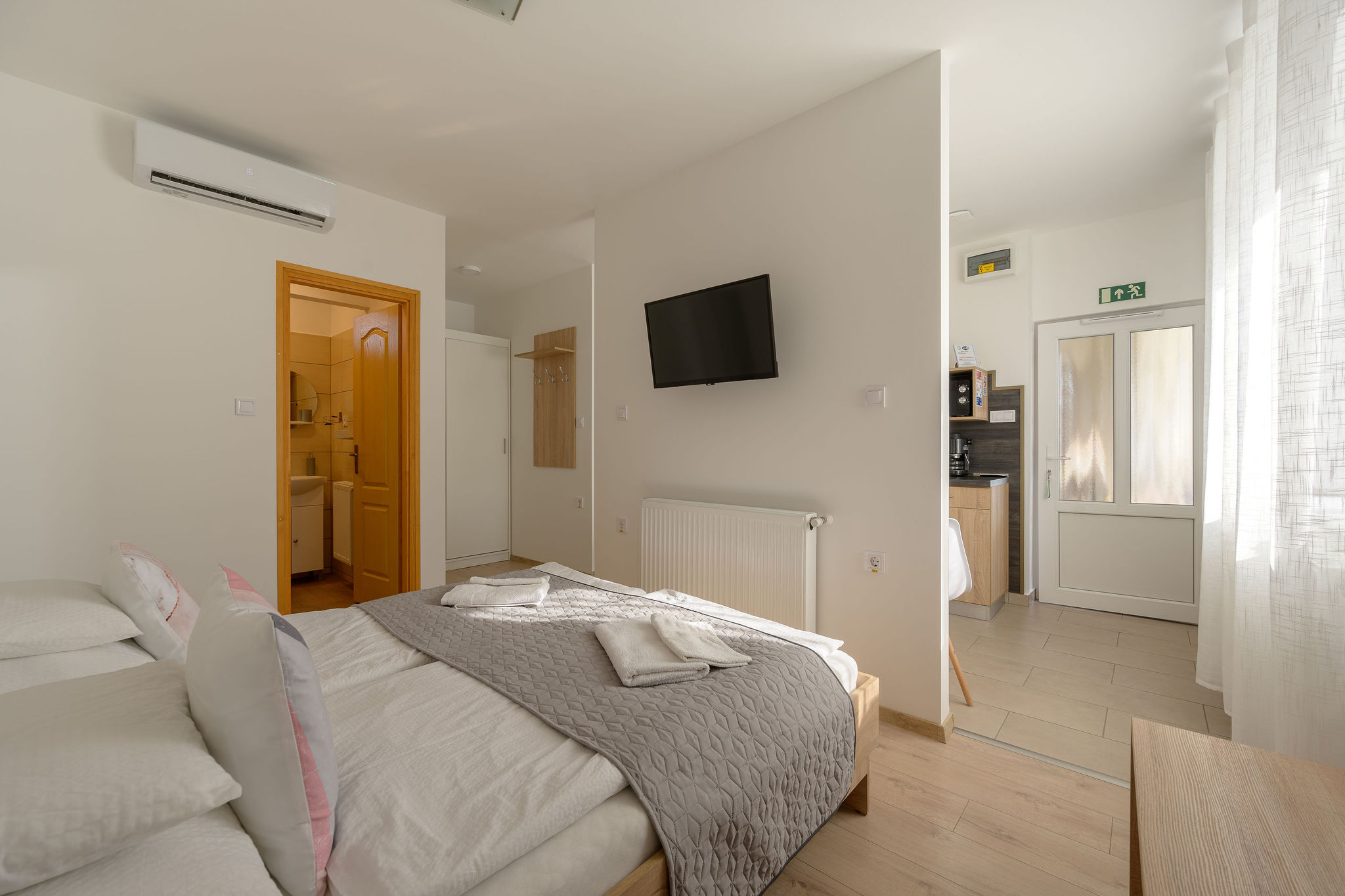A 25 m2 alapterületű légkondicionált apartmanban hálószoba, fürdőszoba, WC, konyha étkezővel található, ahol 1 db kétszemélyes ágy került kialakításra.